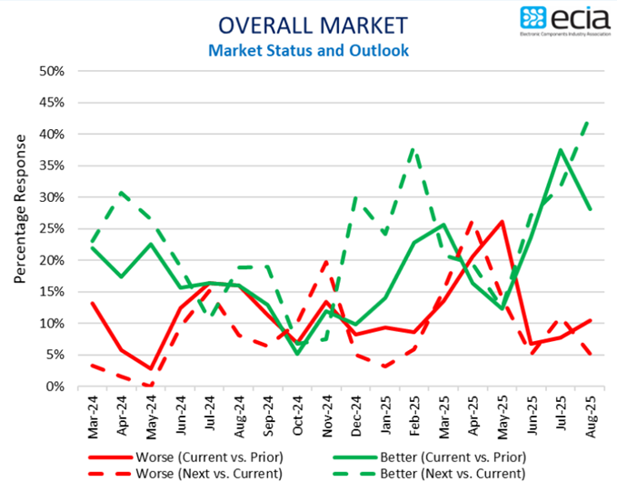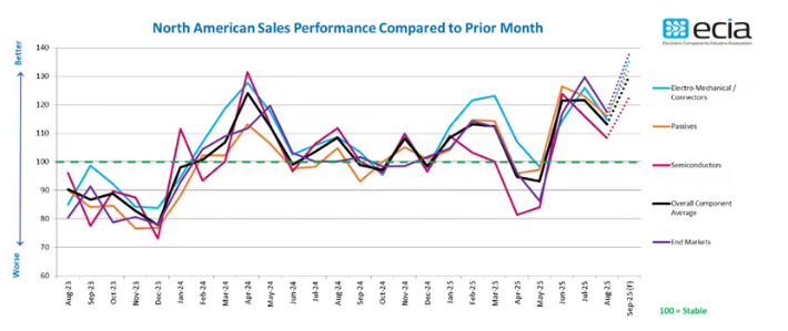 电子元器件销售情绪根据ECIA最新行业调查,在2025年第三季度保持乐观并延续至第四季度。尽管8月份整体指数从7月的121.6下降至113.2,且低于127.5的预期,但受访者普遍预计9月将出现强劲反弹,整体平均预期得分高达130.2。